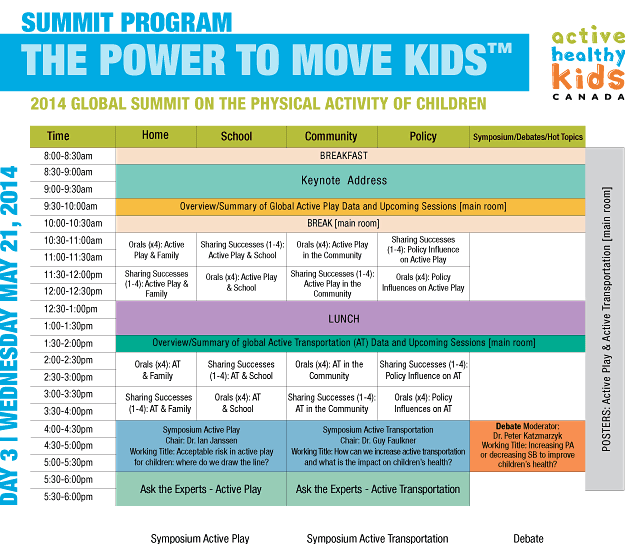Highlights of the Global Summit will include the release of the AHKC 10th Anniversary Report Card and International Report Cards, surveillance and plenary sessions, international best practice workshops, research symposia and poster presentations. Program sessions will drill deeper into the relationship and intersection of childhood behaviours that comprise physical activity (Sport & Recreation, Active Play, Active Transportation, Sedentary Behaviour) and the critical influences on childhood physical activity (School, Home, Community, Policy). Not to be missed will be the high profile keynote speakers, and a culminating Call to Action.
